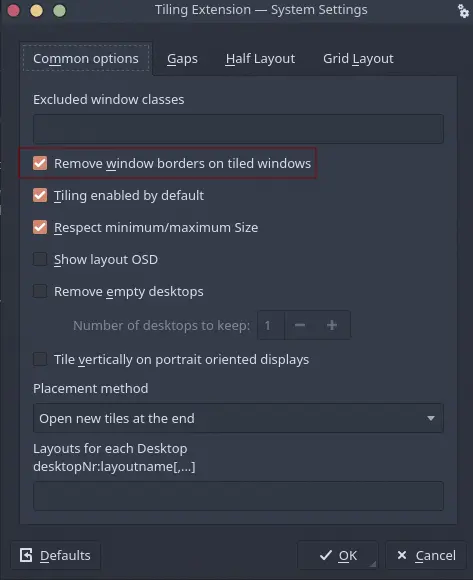 如果你和我一样是使用平铺窗口管理器的话,直接在对应的配置文件设置去除边框就行。另外还有使用平铺脚本的用户可以在对应的脚本管理界面勾选去除窗口边框,以 kwin-tiling 这个脚本举例:
