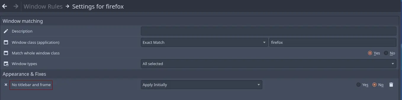 在 kde 上你可以通过 window rules 匹配火狐的 window class 将窗口边框去除,如下添加 No titlebar and frame 属性: